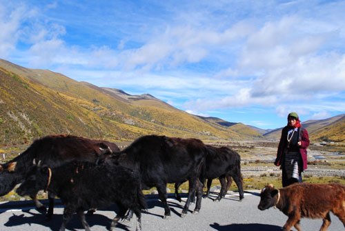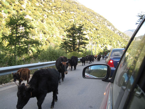 ??? 回归的途中,,,,,很是难堪的我们遇到牦牛群,,,,,它们正通过公路由夏日牧场迁徙到冬季牧场。。。。。藏民们开着拖沓机带上行李举家搬家。。。。。